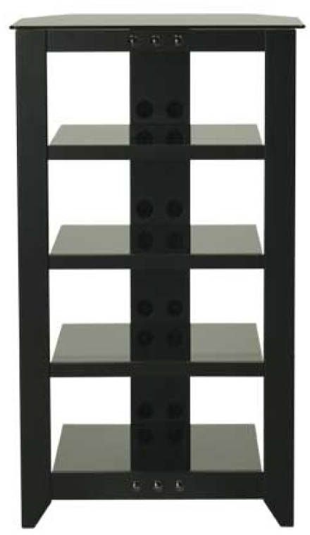 Extra-thick tempered-glass shelves are strong and durable; black and mocha-finished models feature smoked glass. Top shelf holds 60 lbs; middle shelves hold 50 lbs; bottom shelf holds 70 lbs. Top shelf rear corners are angled for positioning in corners. Features include non-slip protector pads to isolate shelves from frame, open architecture for unrestricted airflow and a concealed rear cable management channel.